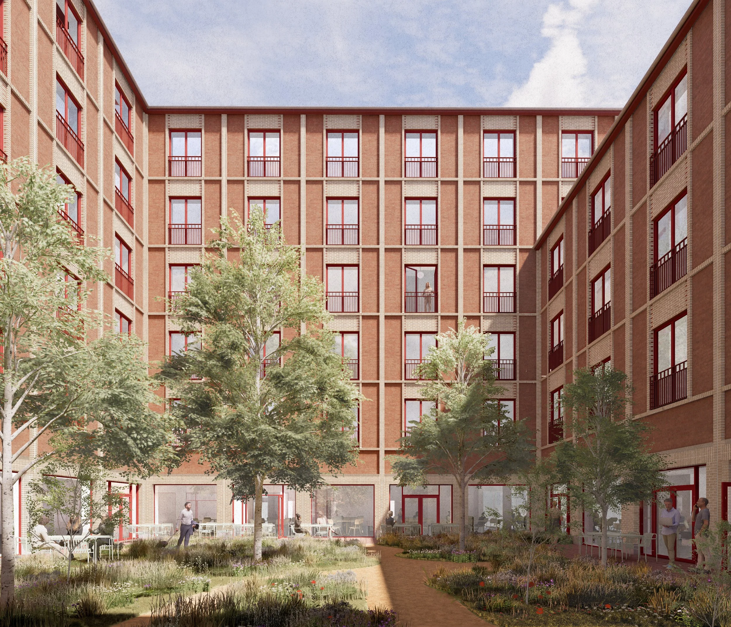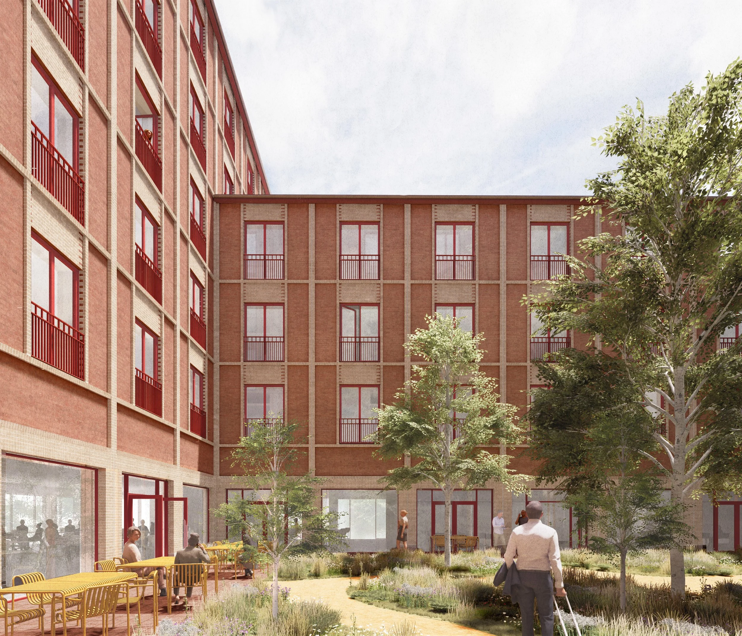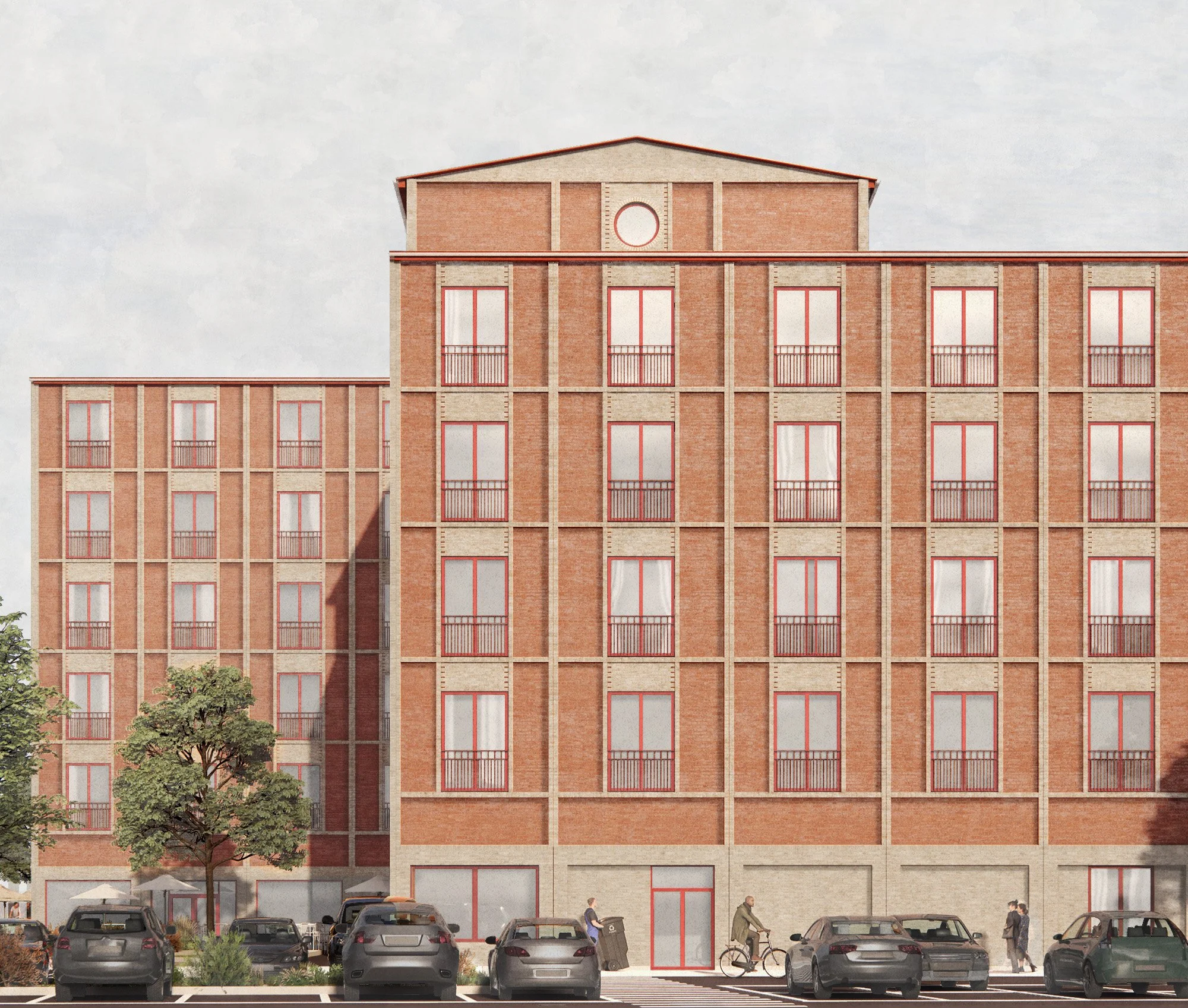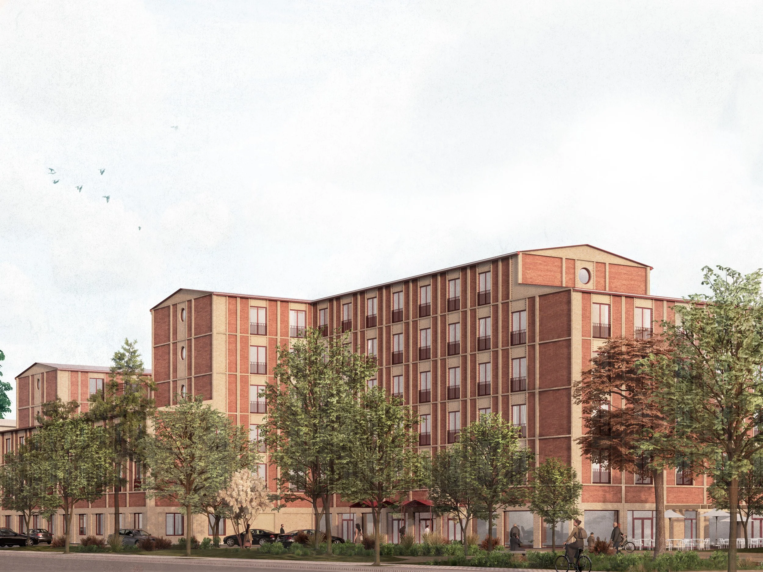 Bygningen udføres med skalmurede teglfacader og lavt hældende sadeltage. Teglfacaderne knytter an til stedets eksisterende kontekst og giver bebyggelsen en robust og stoflig karakter. Facaderne bearbejdes med et reliefgivende rammemotiv, som tilfører de store flader dybde og en signaturgivende rytme. Relieffet understreges i samspillet mellem rammer og tavlfelter og forstærkes af en nuanceret kombination af nye tegl og genbrugstegl. Konstruktionen udføres i beton med reduceret CO₂-aftryk. Projektet DGNB-certificeres, og det forventes at opnå guld.