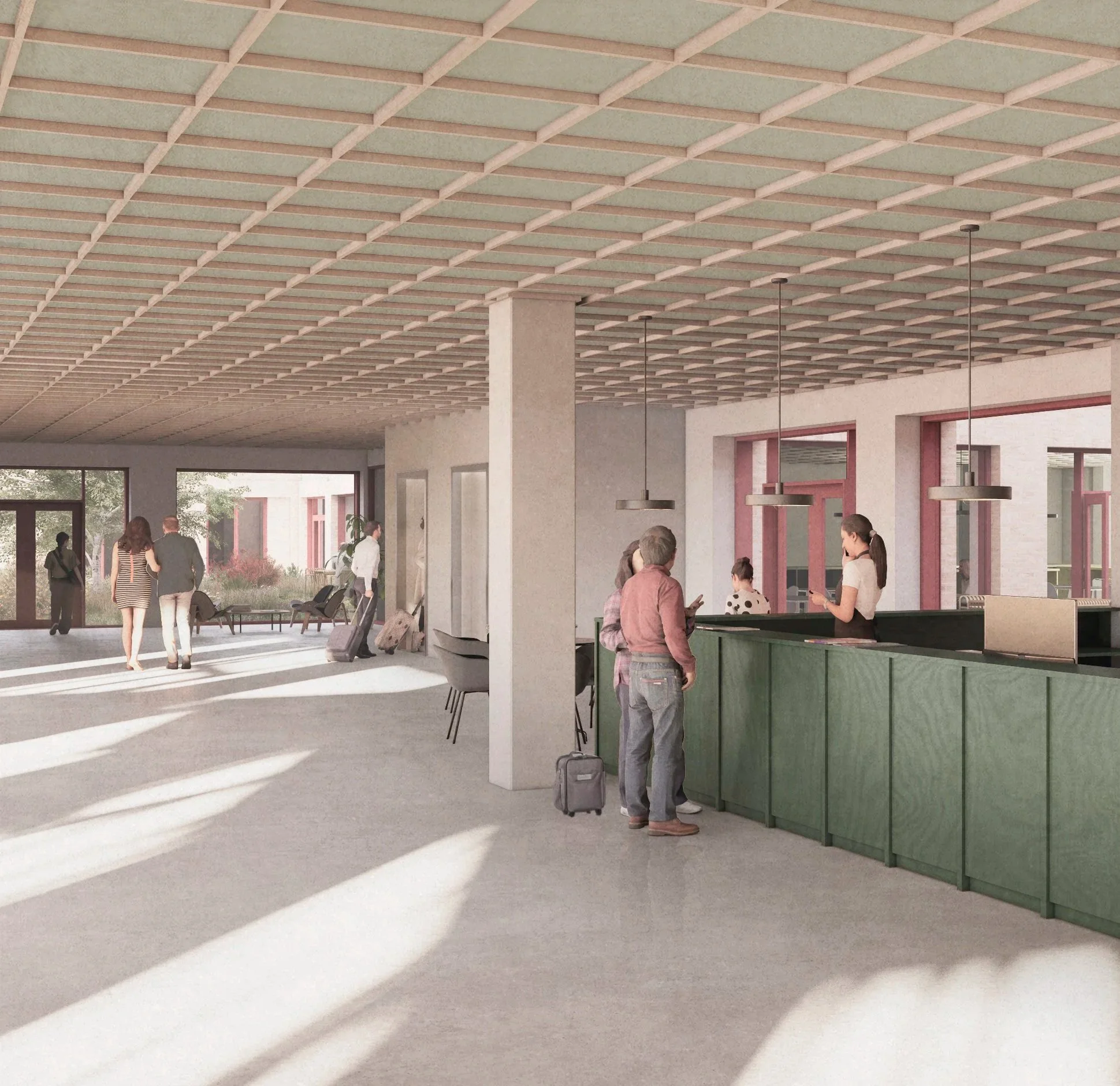 Bygningen er formet som et forskudt 8-tal, der orienterer sig parallelt med alléen og åbner sig mod Kastrup Station. Forskydningen bryder bebyggelsens længde og store skala og danner to grønne gårdrum, der skaber variation, ophold og en klar organisering af hotellets cirkulation. Bebyggelsen trapper sig samtidig ned mod gårdrummene og indpasser sig den omgivende kontekst.